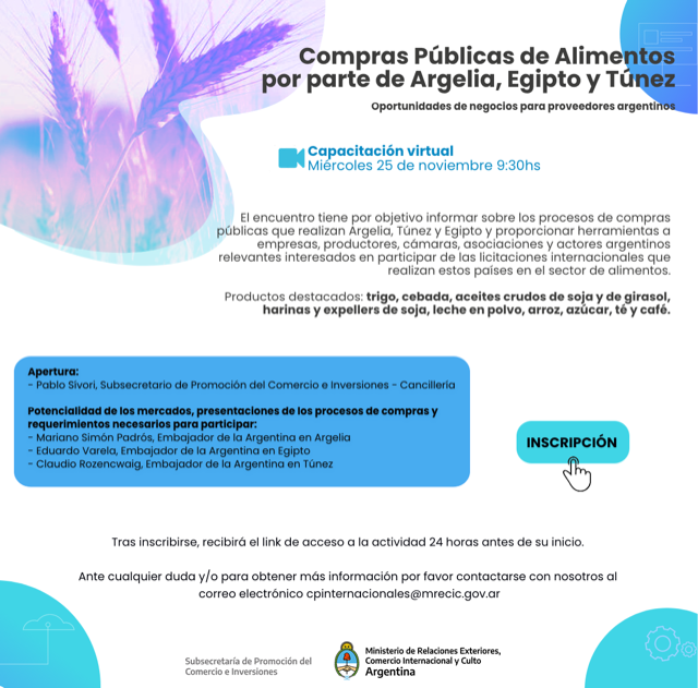 El próximo 25 de noviembre a las 9.30 hs. se realizará una capacitación virtual gratuita sobre "Compras Públicas de Alimentos por parte de Argelia, Egipto y Túnez", organizada por la Subsecretaría de Promoción de Comercio e Inversiones.